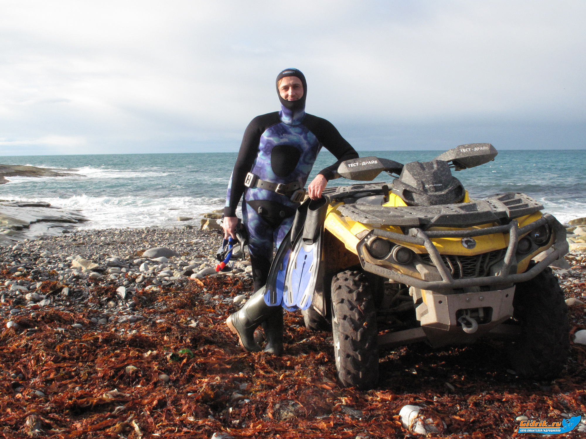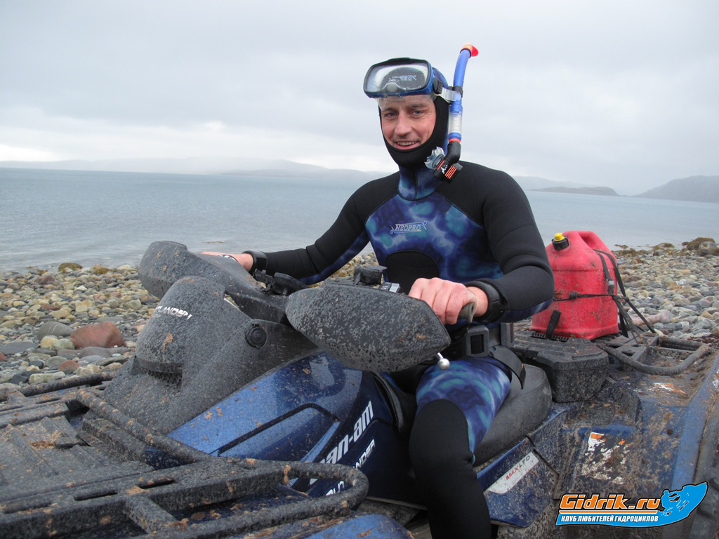 Первый день покатушек, мы решили провести без фанатизма, по шустренькому проехать по маршруту прошлого года, до полуострова Рыбачий. У нас было два Коммандера, один тысячный аут, один лимитовый восьмисотник, пятисотка и чудо технического дизайна, конструкторской мысли, квадроцикл Поларис – про него я напишу чуть позже. В течении всего дня, мы с парнями менялись техникой, обсуждая между собой, все плюсы и минусы. Возле двух братьев устроили перекус и конечно занырнули в Баренцуху. Море было очень неспокойно, так, что первой волной у Олега сбивает маску с трубкой, с головы и последующие попытки найти их в бурных волнах оказались тщетны. Спасло Олега то, что Лёня тоже захватил с собой маску, но нырять отказался, поэтому мы вдвоём с Олегом, поныряв немного при температуре воды+4 , хапнули свою долю адреналина, короче, «отвели душу» и согревшись чаем, двинулись дальше. Каково было наше удивление, когда через десяток километров, обогнув мыс, мы ехали мимо бухты, где была абсолютная гладь и тишь – вот где надо было нырять. Зарядившись мыслью, мы решили это осуществить, на следующий день.