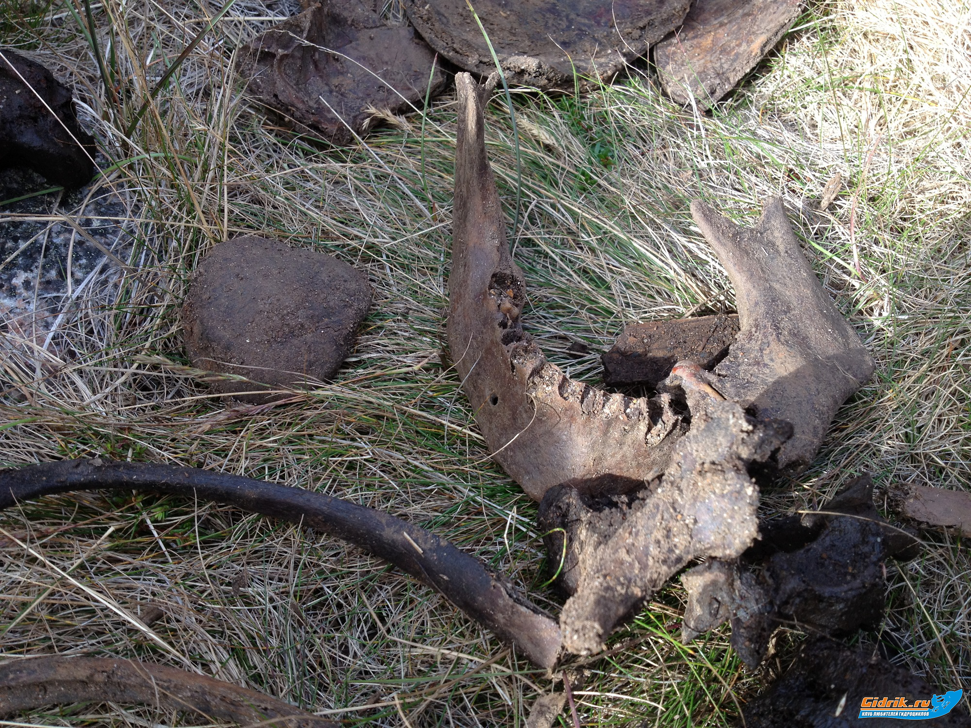 По пути, мы наткнулись на так называемых, Чёрных копателей. Один из парней, одетых в немецкую форму, согласился провести экскурсию, по тем местам, где они производили раскопки и с удовольствием демонстрировал свои находки. Мы так предполагаем, что это не все, а самые безобидные. Среди них, знаки отличия, значки, именной медальон (говорят немцы за него выплачивают 6 тыс. евро), амуницию и самая интересная находка, это останки немца – хозяина того самого медальона. Копатели разложили на траве останки: позвоночник, рёбра, кости таза, рук, ног, пальцев, элементы черепа и нижней челюсти, зубы и даже ногти. Очевидно смерть настигла немца зимой, т.к. останки были в зимней одежде, была видна часть свитера и варежки, а в окоп, где был найден труп, попал снаряд, т.к он был завален и верхнюю часть черепушки так и не нашли, очевидно снесло при взрыве. Конечно я скажу «месилово» там было конкретное, т.к. везде лежали осколки снарядов, мин, горы гильз, и ещё целых патронов. Страшные времена, страшное место. Всё время думалось о том, что мы воевали за свою землю, а вот немцы – хрен знает за что.
