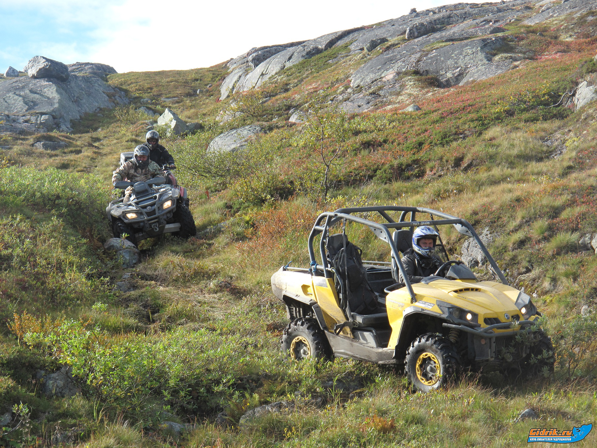 Забравшись на высоту Муста Тунтури, где были в прошлом году, пофотавшись и насладившись видом на Норвегию и Баренцево море, мы двинулись, через огромные камни и валуны по самым верхушкам сопок, то спускаясь, то поднимаясь. Описать словами, какими возможностями обладают квадроциклы в принципе не трудно, но это не будет не интересно, это надо ощутить. В этих экстремальных условиях, всё время думаешь о том, где эта грань, через которую лучше не переступать, а иногда так хочется чуть больше надавить на газ, гарценуть перед товарищами, лихо взлететь на очередной подъём, но всё время останавливает обострённая ответственность за чужую технику, и мысли о том, как смотреть в глаза своим товарищам, случись что, и день покатушек испорчен для всех. Я прекрасно понимаю слова Лёхи Сапрыкина, его просьба: что в поездке, ни грамма алкоголя. Действительно, в таких условиях алкоголь притупляет чувство страха, а техника превосходства конечно прощает многое , но и у неё есть предел. И там за этой чертой, хрен знает, что может случиться, поэтому мы дали слово в поездке, обойдёмся ароматным и незабываемым горячим чаем, который готовит Олежка, это лучше всякого алкоголя.