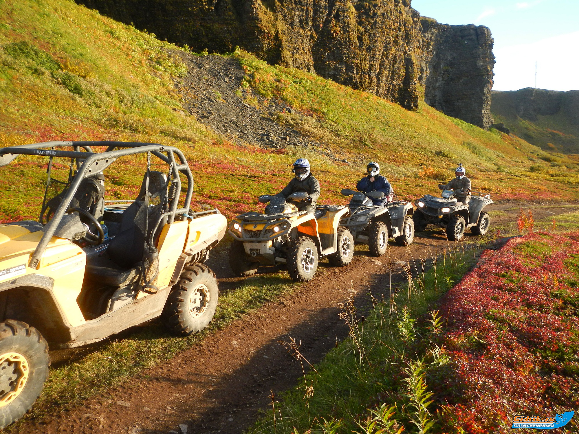 До базы оставалось каких-то 40 км, день шёл к завершению, мы решили чуть прибавить скорость и «прохватиться» по достаточно укатанной дороге. На этом скоростном участке мне достался тот самый Поларис, о котором я писал выше. Огромный, пламенный привет американским конструкторам, как говориться, : «Почувствуй разницу». Если у меня сейчас спросить, какой участок был самым экстремальным, за эти три дня, я бы не задумываясь сказал: тот самый, на котором я ехал на Поларисе. Это чудо техники обладаем своим характером, глазами и мышлением, причём мышление это часто не совпадает с твоим. Ты смотришь на дорогу, думаешь: «надо эту кочку объехать справа, или например, в яму не полезу, слишком глубока, лучше объеду» - хрен вам, Поларис едет не туда, куда вы рулите, а исходя их своей логики и траектории движения. Это пипец! Я думаю, американские инженеры ушли далеко вперёд, искусственный интеллект уже создан и внедрён совершенно секретной технологией в это самый Поларис!!! Я вначале, километров 15-20 пытался бороться с эти интеллектом, но это было бесполезно, и главное страшно, т.к. на такой скорости, приходилось, всё время ловить квадр, и совершенно нельзя было угадать, в какую сторону он сейчас зарулит. Пока я пытался бороться с этим чудом, ребята уехали далеко вперёд, так, что я уже никого не видел и ехал в полном одиночестве, хотя простите, вдвоём: я и Поларис. Слава Богу, что ЛЁха увидел, а верней не увидел меня, замыкающего и все остановились , чтоб подождать наш приближающий дуэт! Подъехав, я просто попросил разлучить меня навсегда с чудом Американской, рекреационной техники. Парни, я вам скажу, какой это кайф опять пересесть на Канадскую технику превосходства! На ЛЮБУЮ!