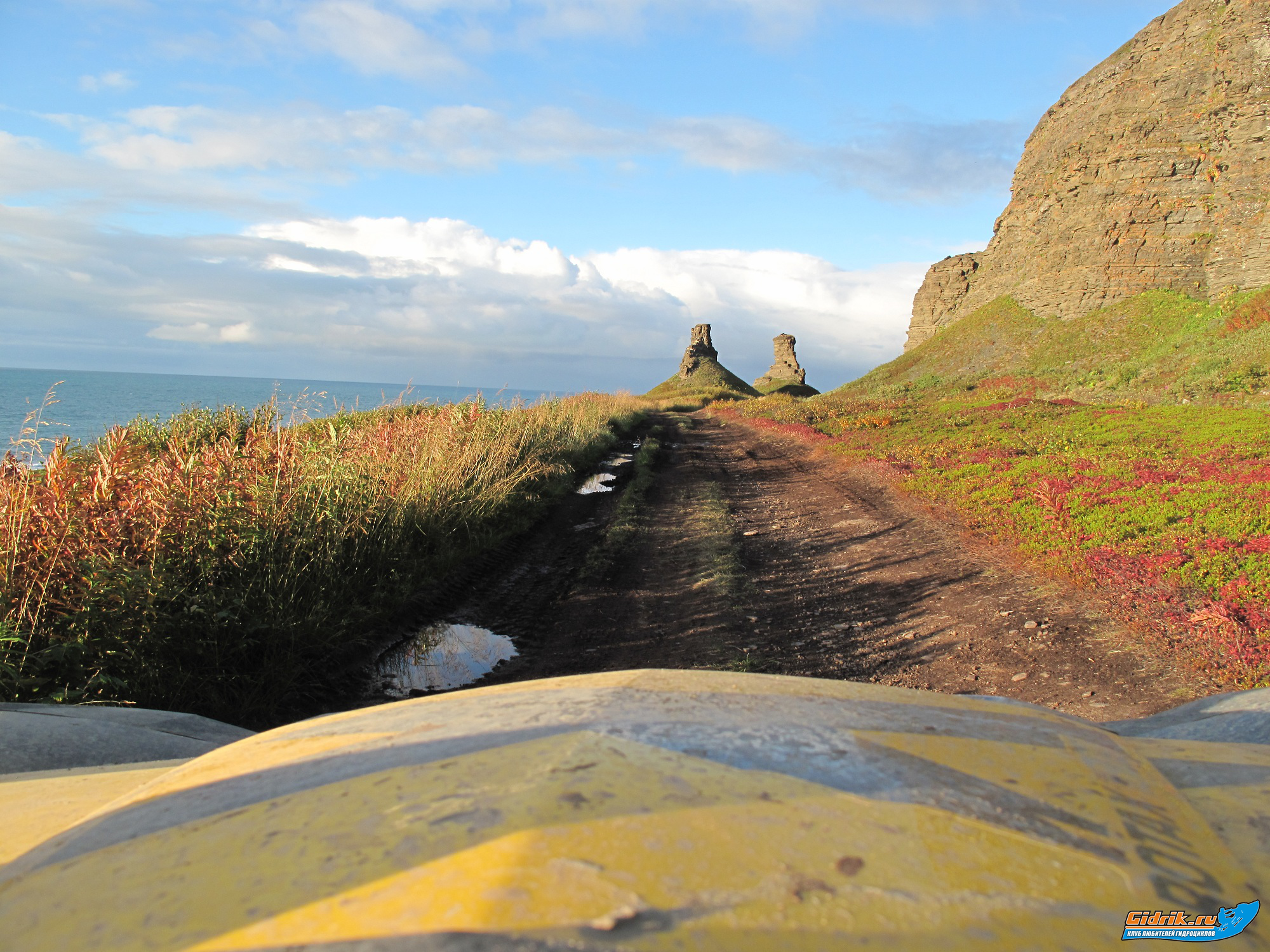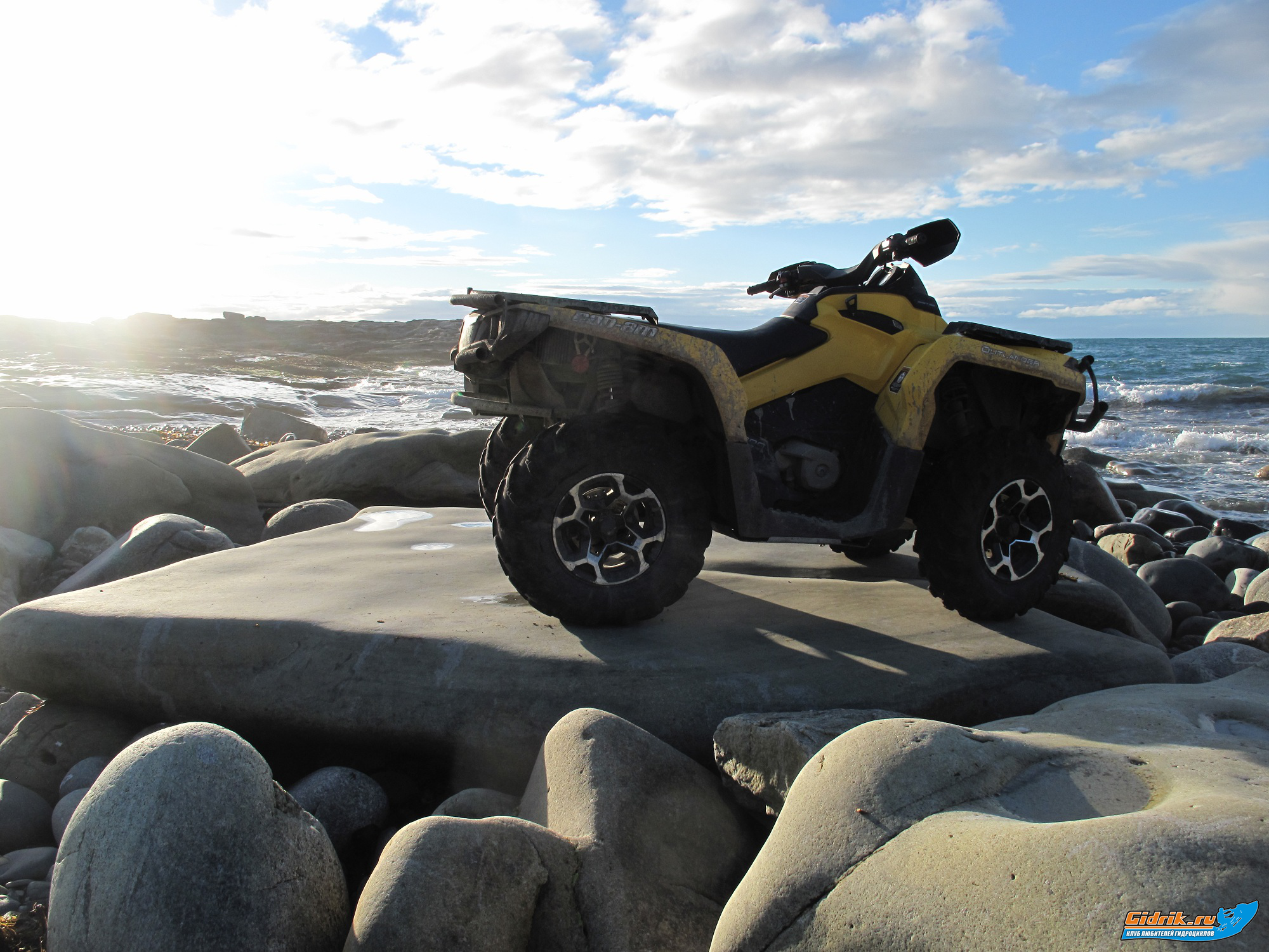 Потихоньку подходил вечер, мы стали спускаться. У нас не обошлось без происшествия. На очередном крутом спуске, квадр Олега Московского, стал заваливаться. Хорошая реакция спасла Олежку от серьёзных травм. Он вовремя спрыгнул вниз, а следом за ним стал падать и переворачиваться квадр, прямо на Олега. Сказалась хорошая физическая форма, ну и конечно армейская подготовка, Олег оказался быстрее. Лимитовый Аутлендер, перевернувшись три раза, остановился. Ни одной царапины! Помог густой ягель и мох. Ещё одно происшествие задержало нас где-то на час. Спустившись с сопок и двигаясь по дороге, мы увидели посередине огромной лужи, стоявший Аутлендер, но не Канадский, а Японский. Как вы уже догадались, это был Мицубиси Аутлендер, наполовину стоявший в воде. Оказалось, девушки, поехали искать своих мужей, которые якобы уехали на рыбалку. То ли мужей долго не было, или жёны решили проверить их улов, короче, очередная лужа стала непреодолимым препятствием. Двигатель нахлебался водички, салон весь в воде и бедные девчонки, мокрые, замёрзшие ждали помощи. Самое главное, что в этой «жопе» не было связи. Совместными усилиями, подцепив трос, двумя квадрами, вытащили машину. Реанимировать её было бесполезно, нужна была эвакуация, поэтому мы записали номер телефона их мужей, чтоб позвонить им, оттуда, где есть связь и сообщить о месте нахождения и рванули дальше.