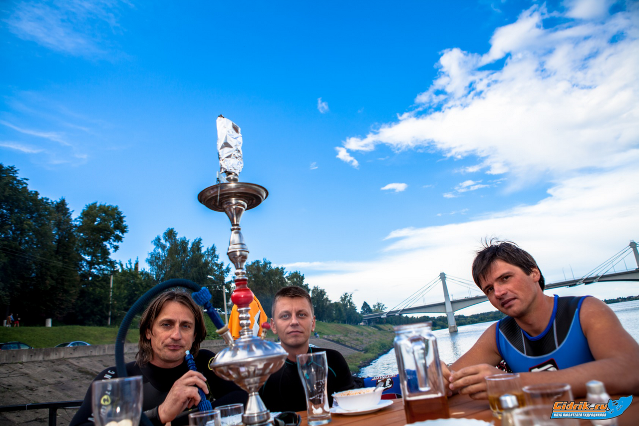 После обеда, подъехал Гена и Женя и мы все вместе рванули по Волге, в Кимры. Погода, всё время вносила коррективы, периодически лил дождь, поэтому дальше Кимр мы не пошли. Засев, в прибрежном кафе, мы вкусно поели, попили и покурили кальян.