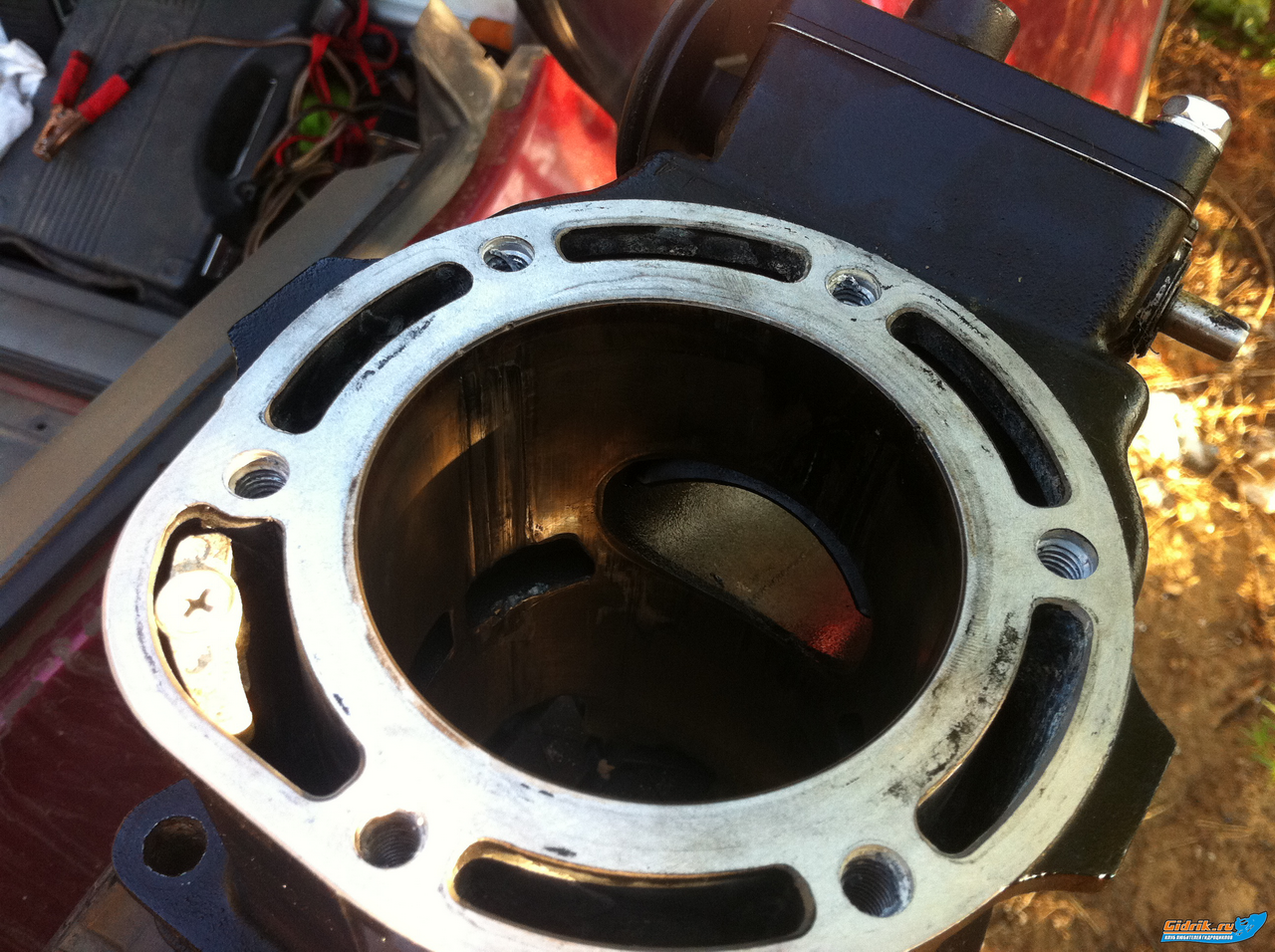 и вот еще, там поршень в двух местах подрало? на против впускных окон?