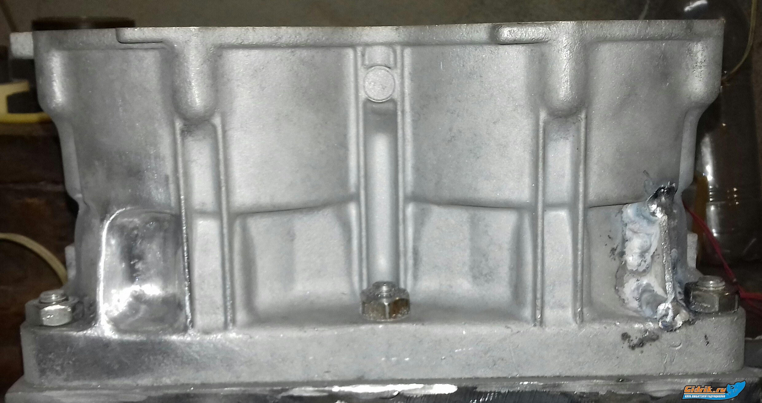 Продолжение! Сразу извиняюсь, текста будет много Привёл блокдля к дальнейшей работы. Ударил в круг песком. Изготовил приспособу металл 12мм, подстраховалмя так сказать чтобы при сварке рёбер не потянуло блок, крепёжные уши. Изготовил рёбра из эл. шины 8мм. Таким образом из 62т-701 блока получаем усиленый ...64х-760  . Поясню для тех кто может не в курсе! Так как сток вых.труба 760-64х на порядок тяжелее чем сток труба 62т-701, и как известно ...они крепятся на блоке цилиндров. Вибрация то же мотора 760 выше из за большего объёма да и прыжки, удары об воду сюда же, и блок в этих местах трещит! Конечно это можно обойти, установив опоясонуб тюненую голоау которая кремится как к самому блоку так и стяжными шпильками к кейсу в место болтлв. В моём варианте сток голова 62т. Смотрим фото