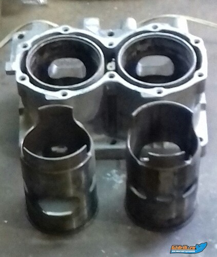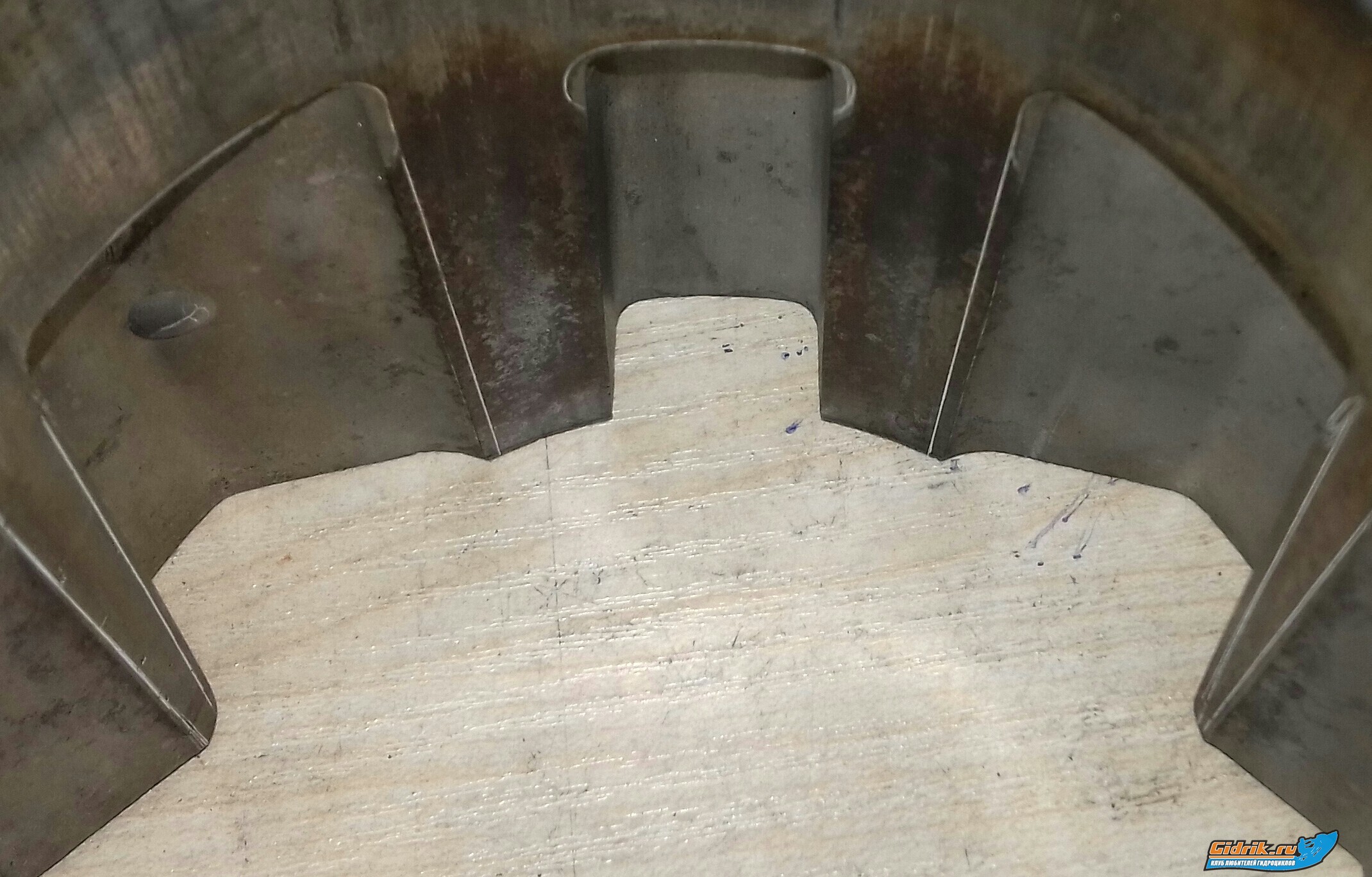 Сегодня вынул гильзы и разметил транспортные каналы портов передач которые перед тем как снять гильзы размечаем через впускные окна. Можно просто зоны в портах совместить и будет в разы лучше работать чем зажатое окно с неправильной продувкой цилиндра. Выдерживая правильную форму канала... а он конуксный, от камеры перегрузки к портам передач уже. Тем самым мы не теряем падение скорости смеси на выходе из порта, чем обоспечиваем максимальное наполнение и удерживая выстроенную колону смеси от разности скоростей, от размеров окна и углов переноса в портах гильзы! Пятна, вздутия в канале, это те места где вваривались рёбра жосткости, будте осторожны, стенки тонкие! На мой пальцемер где 2-3мм.