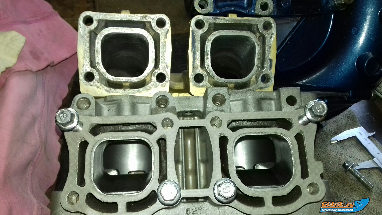 Всем привет! Откатал последние выходные в общем часов 15 с новым жеттингом моторчик координально измениля в +, низ, середина, верх везде самолёт и раскидывать не хотелось. Винт на старте срывается ( прорывался на озёра по ручьям мелковатым ), думал писта винту ан нет всё цело. Ну в общем с 15-ого в отпуску азарт своё взял, раскидал дрыгатель. Водомёт перебрал  сальники wsm поставил, подшипники огонь оставил те же. Не совсем уверен в вине колхозных сальников, рабочая зона на валу пальцемером ощутимо износ но он и был до того. Посмотрим что wsm покажет. Винт перегнул 14/18. Проточил новый блок под свои же sbt, поршня напыл только пошерхаля. Зря выхлоп полировал, решил тунели выхлопа и коллекрора раздвинуть малехо  , коллекто готов, пилю в блоке, прокладка показывает на сколько. Порта выхлопа после расточки в минус ушли - буду правиь на 1мм примерно на сторону еще не считал конкретно.