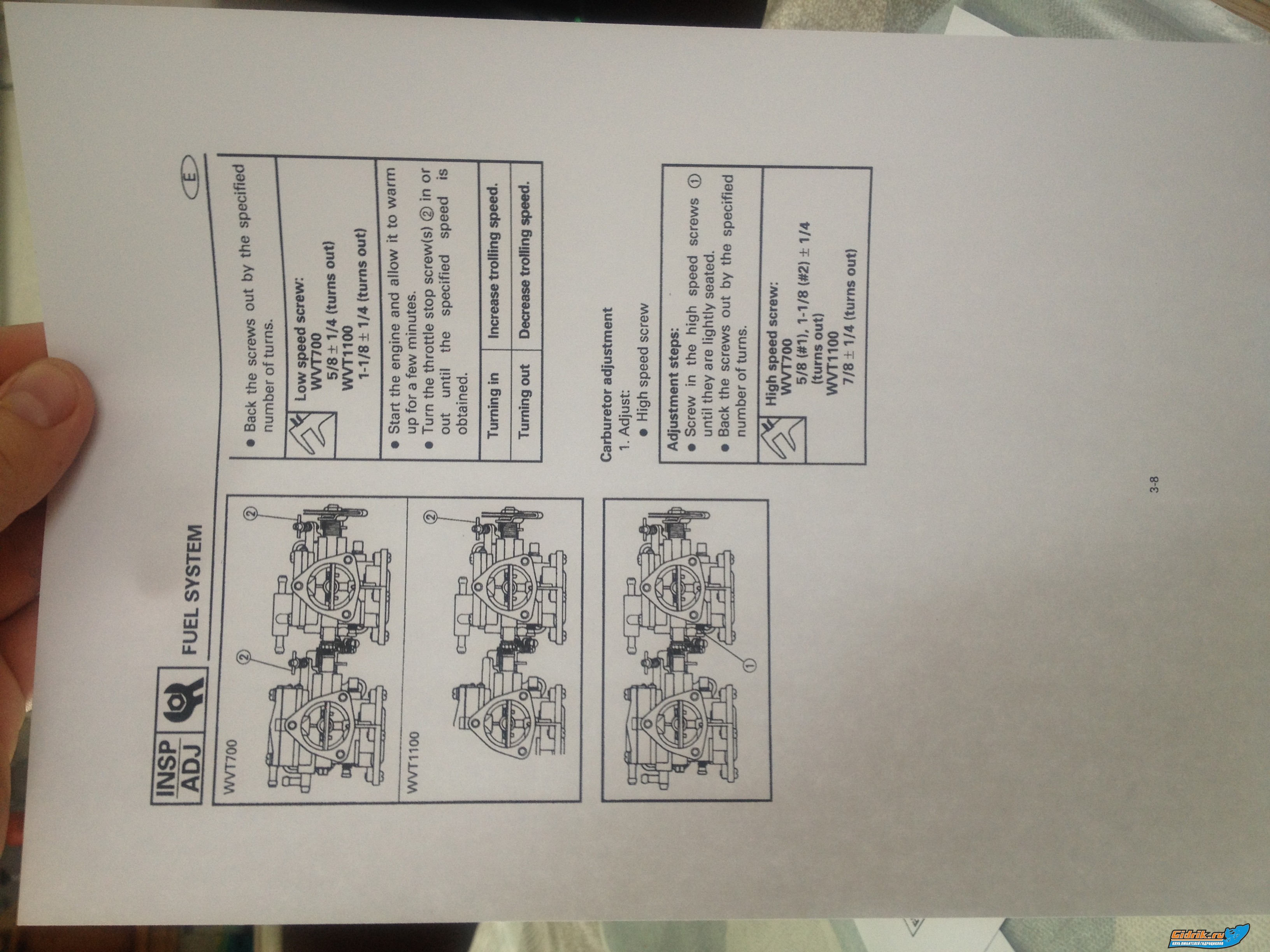 Dimon123 писал(а): Парни помогайте )) читаю книгу вижу фигу ! Непонимаю я сколько нужно и какие винты крутить на карбюраторах чтоб выставить середину по мануалу ? Кто шарит подскажите мне сколько оборотов и какие винты ? Перевёл мануал и въехал в пень нефига непонимаю ....   Ка карбах возле винтов стоят H с прово,L с лево. Нарисуй круг,раздели на 8 частей. Винты крутятся по кругу). +-это допустимая подстройка за 1тест.#очередность карбов. 1-1/8это -один оборот минус 1/8или 7/8. Твои настройки в таблице верхние.коромисла как в мануале. И нафига тогда ты закачал переводчик если там одни фиги??