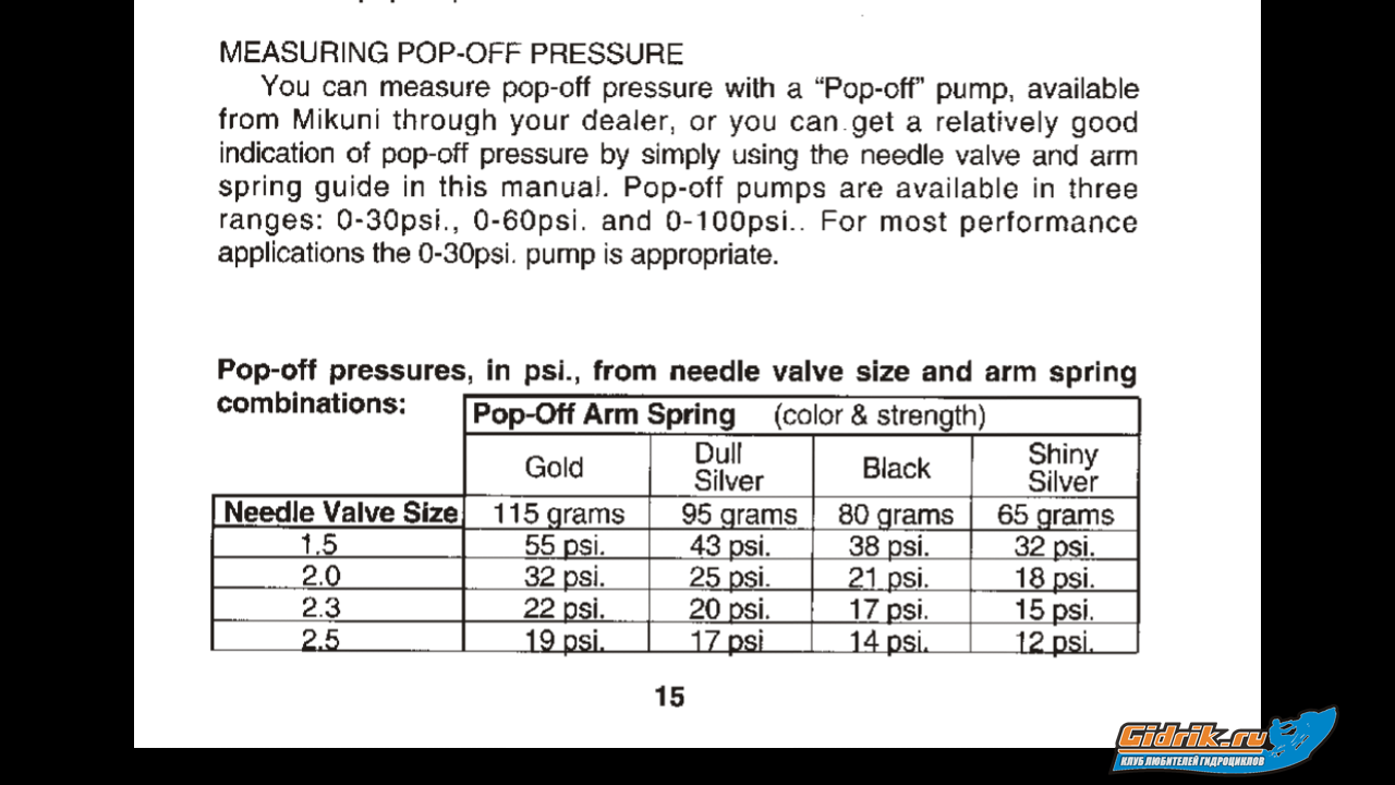 igor sea-doo писал(а): Олег23 писал(а): frig писал(а): Там же какой-то mikuni bn? Иглы должны держать порядка 0.6 бара 30 секунд. Проверить можно не снимая с мотора. Перекройте обратку (или не открывайте, раз она у вас и так перекрыта), накачайте компрессором пол атмосферы и посмотрите падает давление или нет. Или на подачу компрессор, а на обратку манометр. Так иногда проще. Смотря какой размер седла. Там может давление открытие 50 psi,это больше 3 х кг. а при чём тут размер седла???не пружинка ли давление регулирует?они ещё разные бывают по цвету,соответственно разное давление держат.не слышал? При том чем больше седло если ты не в курсе тем меньше давление открытия чем больше площадь давления на иглу тем меньшее давление нужно что бы ее открыть. Пружинки это уже другой раговор, если взять одинаковые пружинки и седло например 1.2 и 2 так вот на 1.2 будет 50 psi например а на 2.0 будет 35 psi. Вроде ремонтом занимаешься а простых вещей не догоняешь.