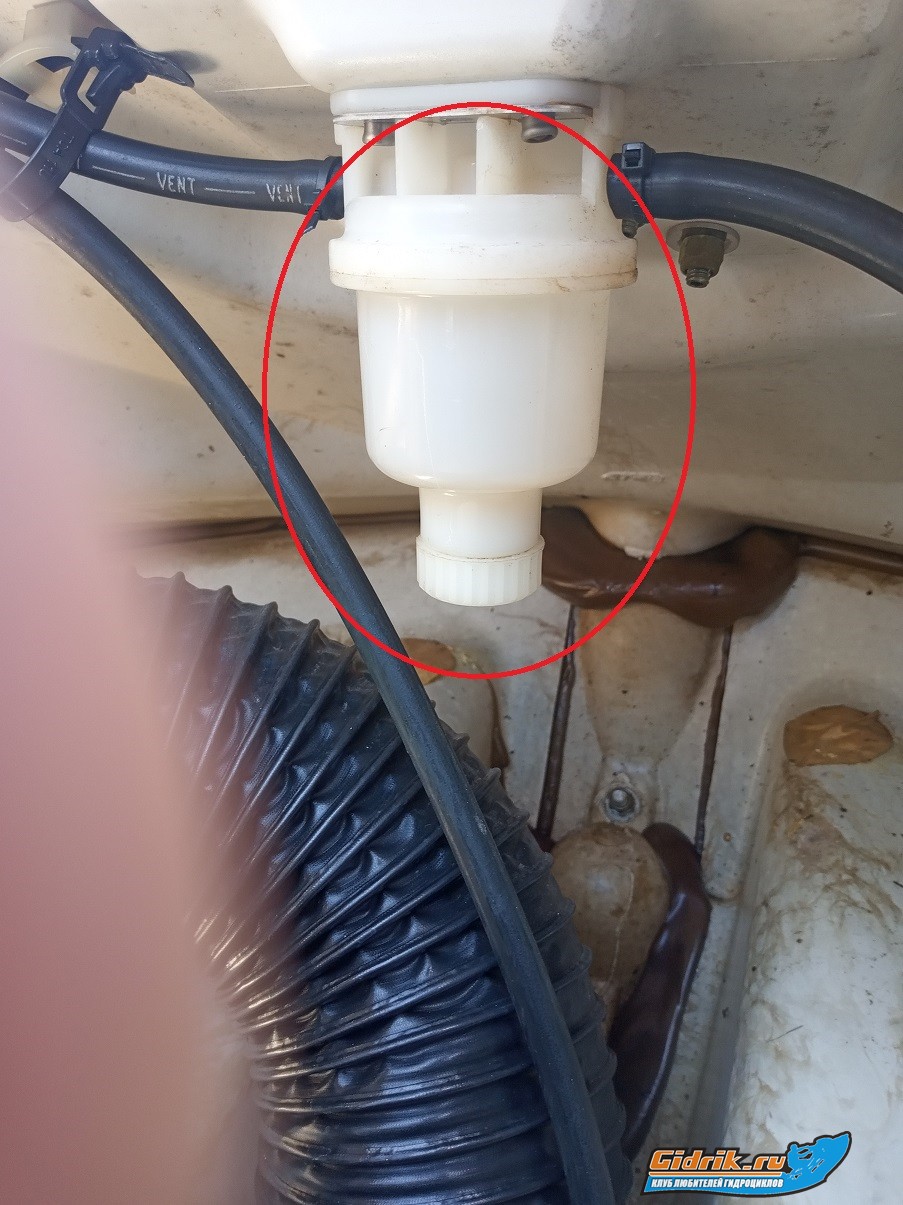 Белый подвесной стаканчик с крышкой внизу - сепаратор, отделяющий воду, не дает ей попадать в бензобак. Кстати, полезно после покатух откручивать крышку и сливать если туда что-то попало. Из этого сепаратора трубочка вентиляции обычно идет либо просто в трюм, либо в маленькую белую коробочку брызгоотсекателя под капотом, а из нее уже в атмосферу. Это канал вентиляции бензобака, обеспечивает приток воздуха в бак по мере расхода бензина. Клапанок - клапан, пропускает воздух в бак а обратно нет.