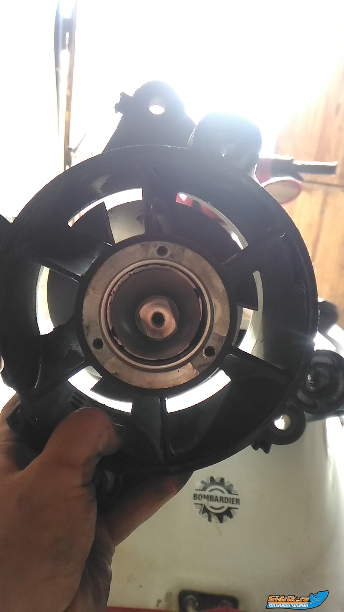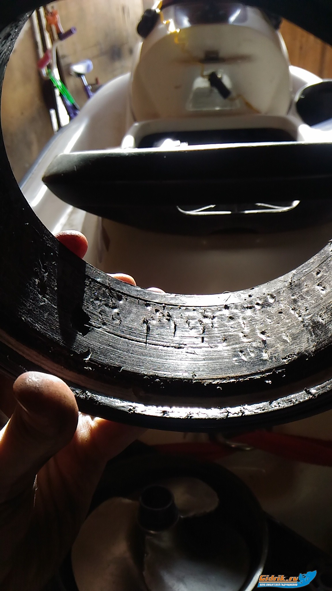 Спрямляющие на удивление слегка покоцало.Кольцо однозначно под замену,создай тему в разделе куплю запчасти ,,куплю кольцо водомета 140мм,, те кто занимается продажей запчастей сами напишут.Зажимаешь валик в тиски за губки которые на фото,импеллер откручиваешь ,,заводилкой мотоцикла,, ключа естественно у тебя нет,как и у меня,приходится так выходить из положения.Доставай валик и смотри внимательно на предмет раковин,состояние подшипников