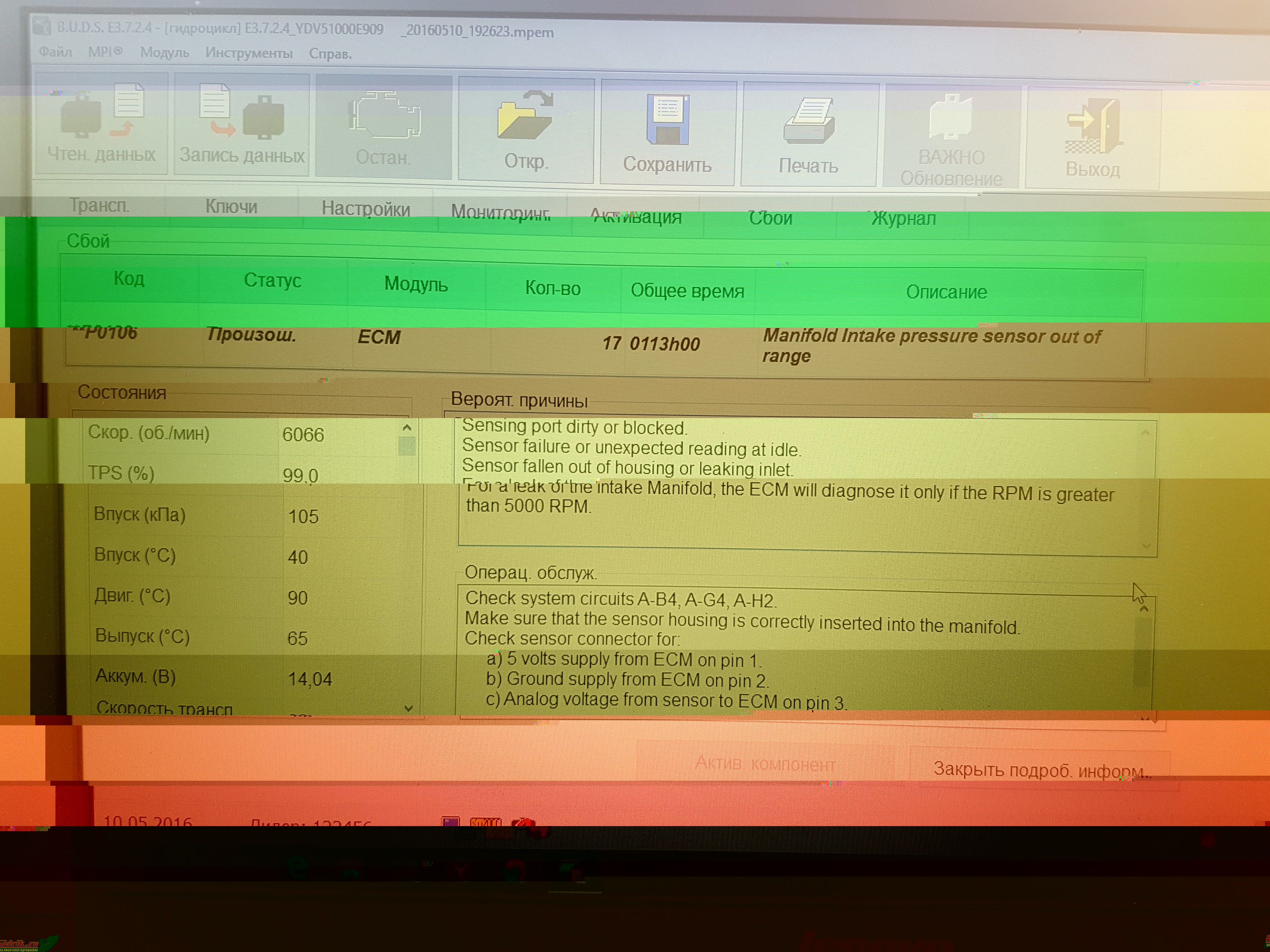 На почти полном ходу прозвучал однократный сигнал и загорелся чек - отпустил газ, заглушил, посмотрел - что все на месте. Завожу, динамика разгона пропала, при приближении к показателю тахометра в 6000 об. загорается чек и выше не набирает, отпускаешь газ чек тухнет, развиваешь обороты вновь и к 6000 опять загорается чек. Этот цикл повторяется раз за разом. Сделали диагностику показала неисправность датчика температуры воздуха впускного коллектора. Датчик поменяли, мозги обнулили. История повторилась вновь, при диагностике выдает ту же ошибку.