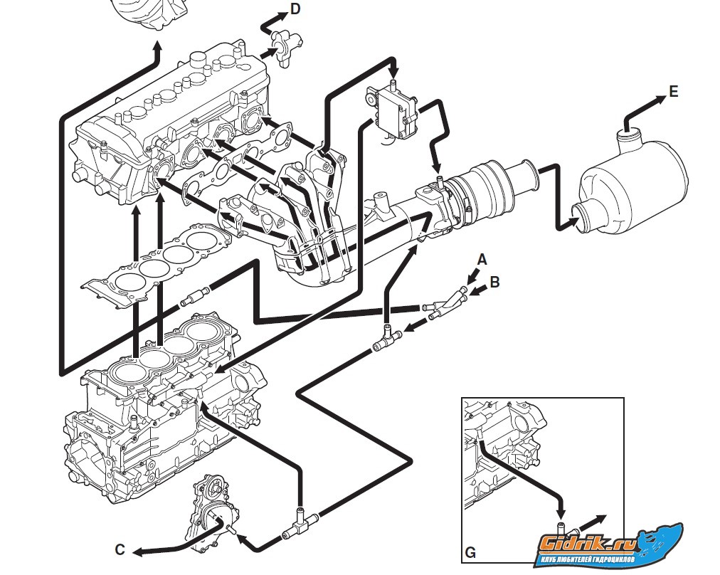 Ватербокс это глушитель - банка такая алюминиевая сзади в корпусе стоит , цпг - цилиндро-поршневая группа , а промываю я всегда так - в шланг подачи воды для охлаждения движка начинаю лить через воронку антифриз (на заведенном движке ) как начинает литься сзади с водомета с обратки значит хватит лить , чуток погазовал и глушу , потом наклоняю гидрик в сторону водомета сливаются остатки антифриза и все готово . Шланг куда антифриз лил на место подсоединяю !Вот к примеру схема прохождения воды через мотор у ямахи FZS .А B подача , D обратка
