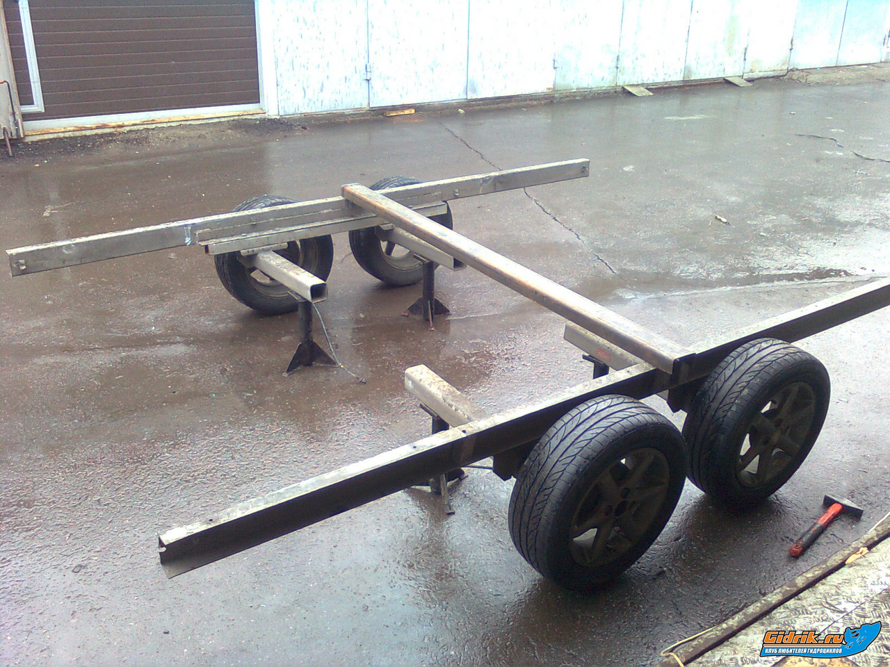 +1 Саня, по чертежу, у тебя ось сдвинута назад, т.е. будет нагрузка на фаркоп офуенная. Посмотри заводские телеги, она стоит где-то по середине. Чё скажешь?