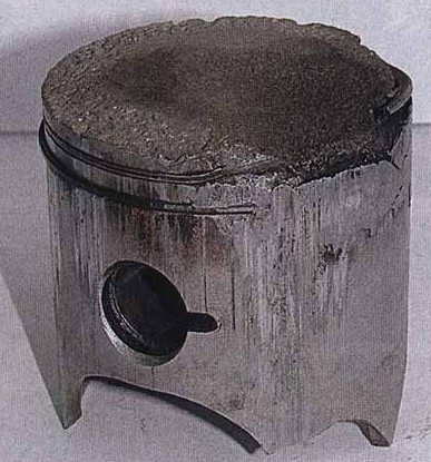 4) ортыв верхней кромки поршня по окружности. (по верхее кольцо) - прихват кольца. -- зачастую из-за прекращения подачи смазки. -- (редко) неправильный тепловой зазор. (неквалиф. ремонт)