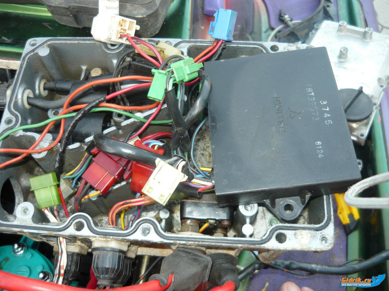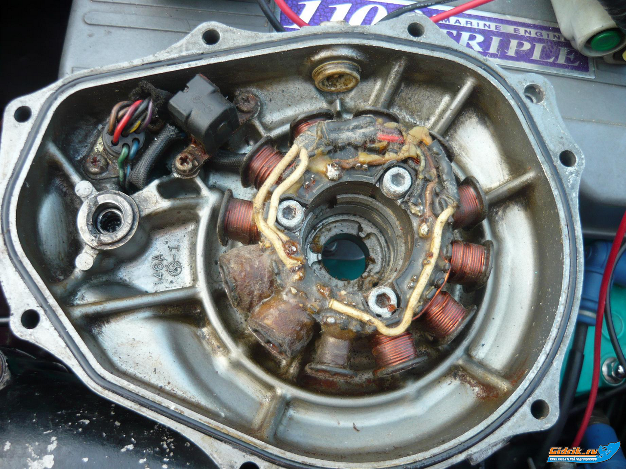 теперь вот эти 3 очень залитые катушки на гене, по схеме от них идут провода (pu r y) это я так понимаю "зарядные катушки" - они вырабатывают напряжение около 70Вольт (переменки) и заряжают конденсато системы CDI который свои разрядом на катушки зажигания и образет искру. в них довольно часто бывает проблема.