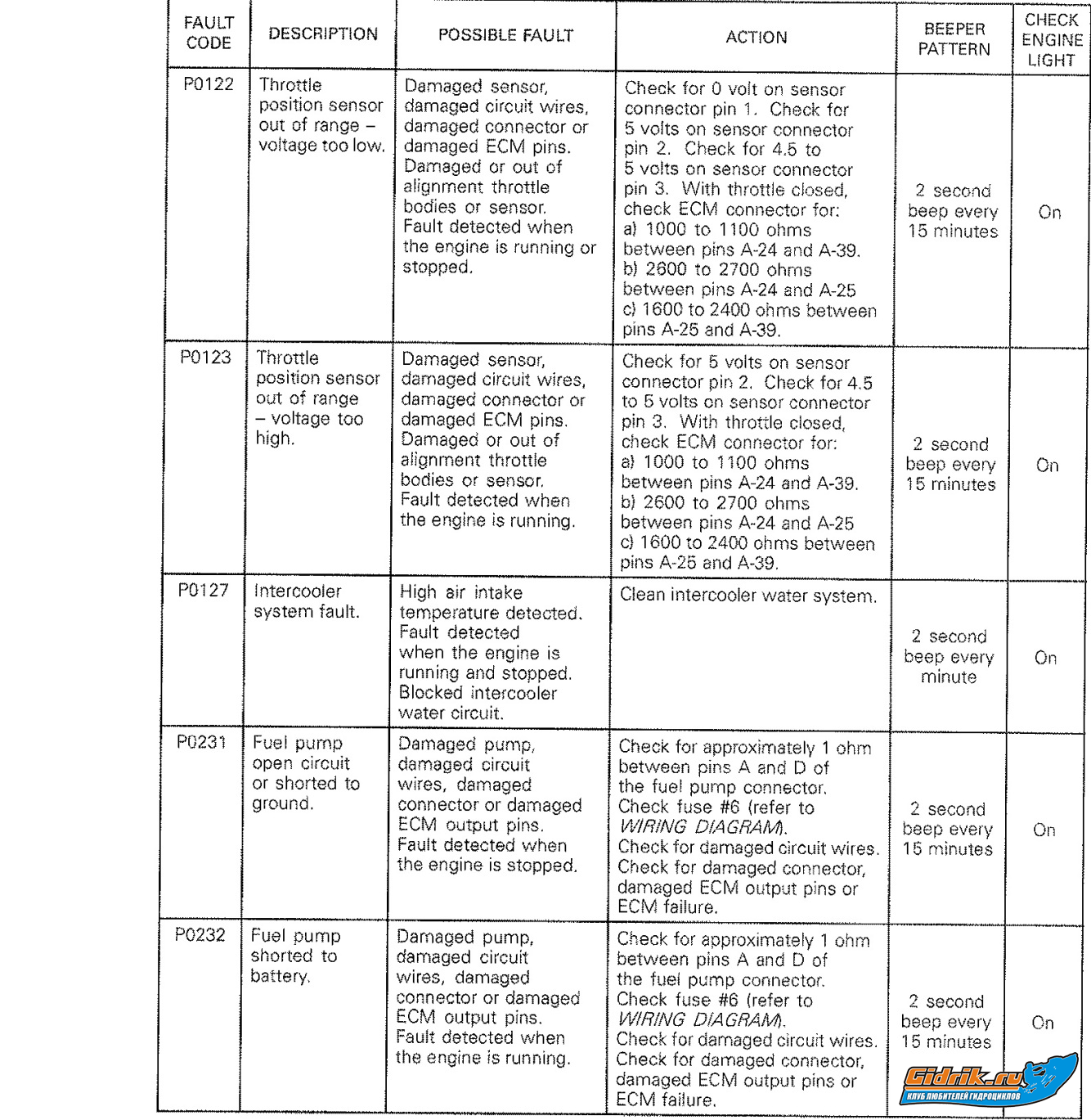 Ай спасибо!!! Я уже вторые сутки рою инет в поисках сервис-мануала, чтобы разгадать эту 122-ю ошибку! Честно говоря, я и сам склонялся уже к этой мысли. Причем, скорее всего это вода, т.к. патрубок я только собирался снимать, но не успел))) Соответственно, ничего там нарушиться не могло. Сырость внутри присутствует неизбежно, т.к. гидроцикл в настоящее время хранится на воде, и возможности хорошо просушить нет. Кроме того, пока возвращался на базу прыгнул на волне от встречного баркаса с солидным водоизмещением - и, о чудо, подумал я, ошибка пропала. Но радость моя была недолгой. При следующем пуске двигателя ошибка выскочила снова, и уже не пропала до момента прибытия на стояночный пирс.