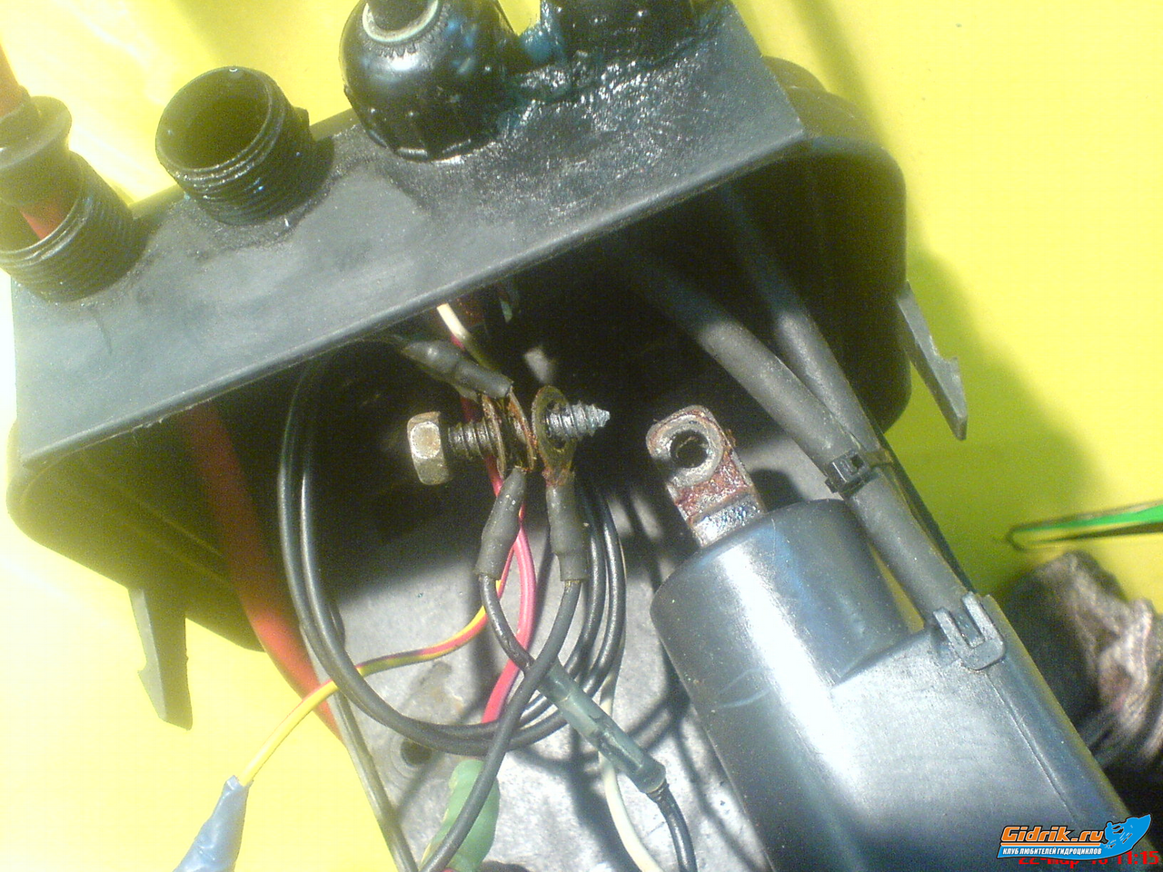 продолжал занятия секисом с проводкой. Разобрал электробокс, и присел от удивления. В нем вода! гидру просушил уже раз 5 наверно пока работаю в гараже грею воздух пропусая его через гидр, дабы в гидре работать было приятнее ,теплая она и все гнеться легко.