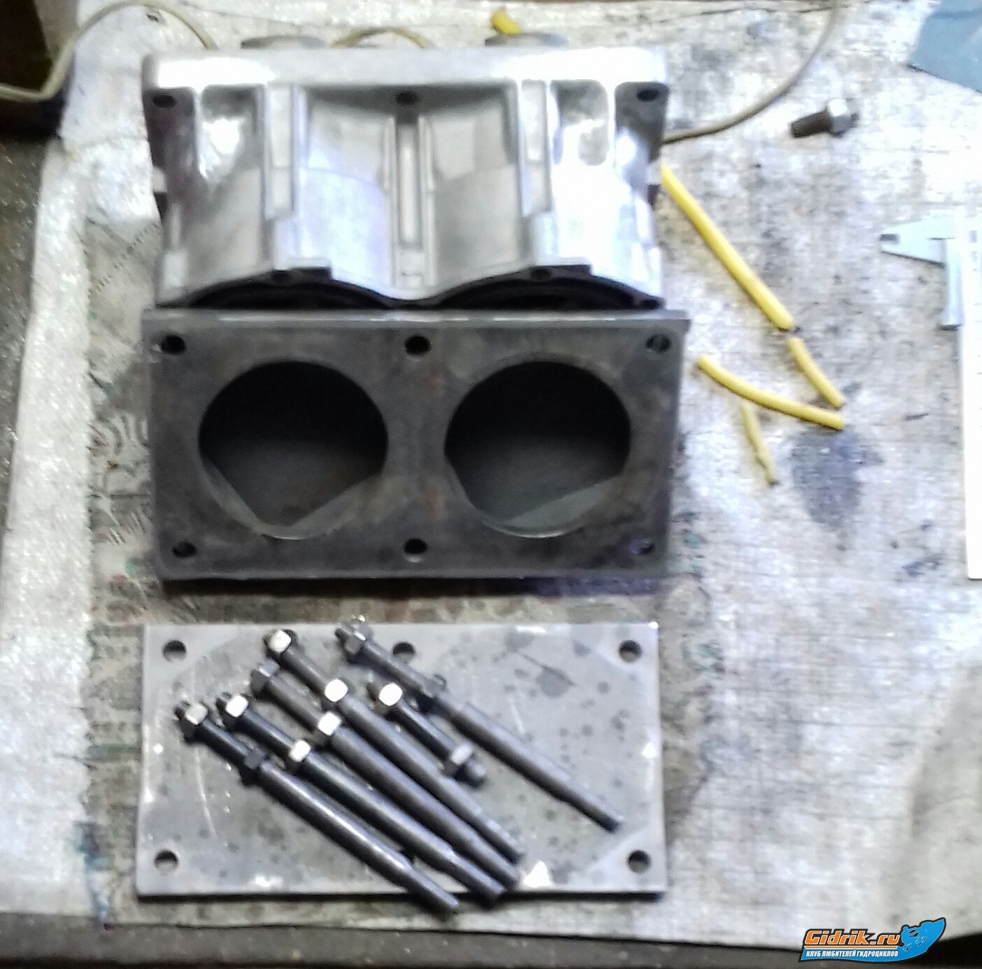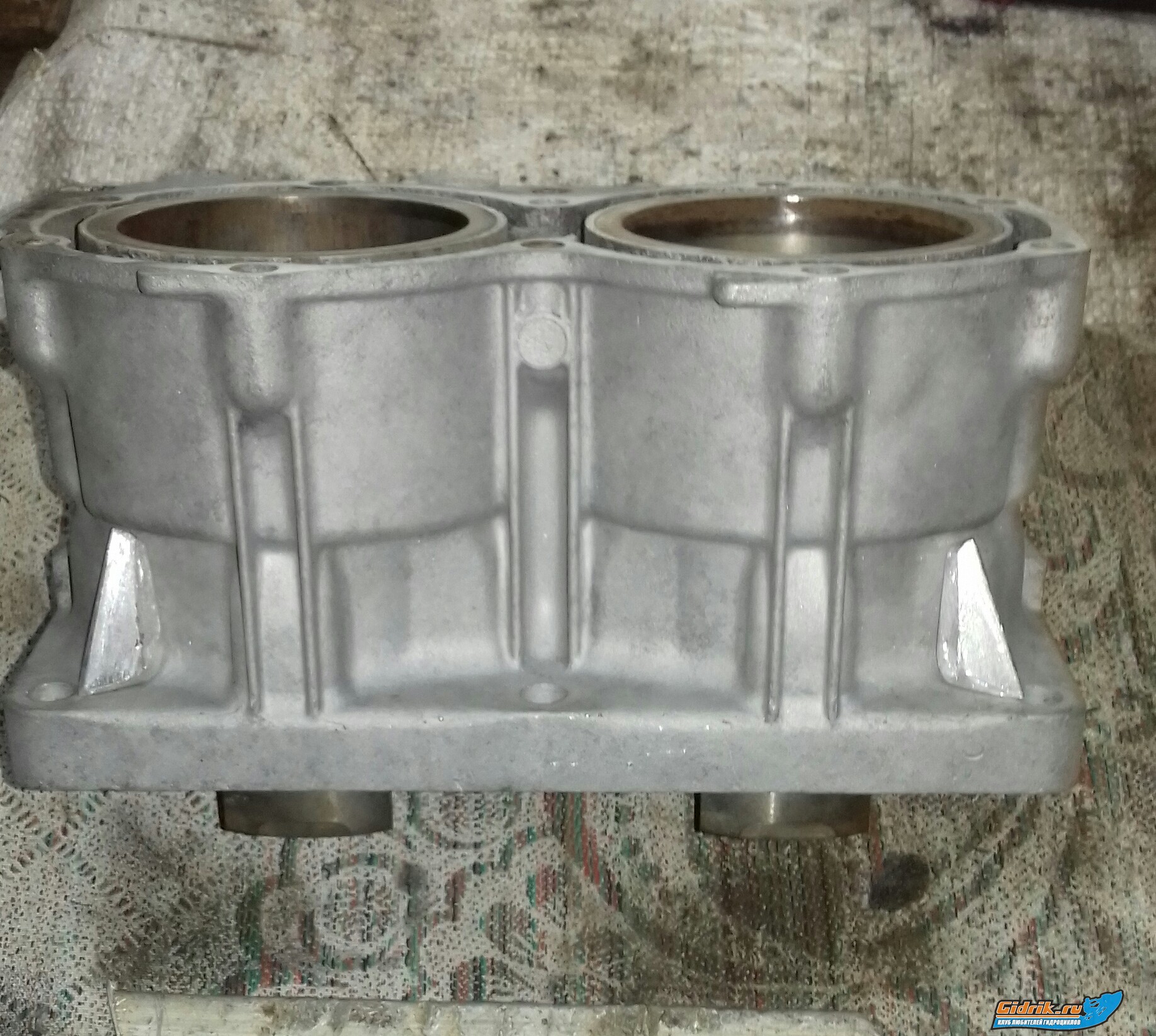 Продолжение! Сразу извиняюсь, текста будет много Привёл блокдля к дальнейшей работы. Ударил в круг песком. Изготовил приспособу металл 12мм, подстраховалмя так сказать чтобы при сварке рёбер не потянуло блок, крепёжные уши. Изготовил рёбра из эл. шины 8мм. Таким образом из 62т-701 блока получаем усиленый ...64х-760  . Поясню для тех кто может не в курсе! Так как сток вых.труба 760-64х на порядок тяжелее чем сток труба 62т-701, и как известно ...они крепятся на блоке цилиндров. Вибрация то же мотора 760 выше из за большего объёма да и прыжки, удары об воду сюда же, и блок в этих местах трещит! Конечно это можно обойти, установив опоясонуб тюненую голоау которая кремится как к самому блоку так и стяжными шпильками к кейсу в место болтлв. В моём варианте сток голова 62т. Смотрим фото
