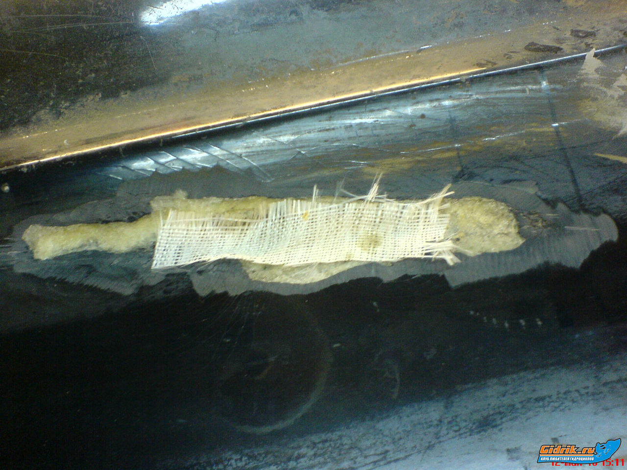 Смазываем смолой, и нанося слой за слоем наномис стеклоткань на язву... далее промазываем смолой и даем сохнуть, ждать до завтра я не буду, ибо время жмет, по этому когда смола схватиться буду просушивать феном или обгревалкой чтоб встала за 2-3 часа. Далее вышкуривание и повторно все до выведения до первоначальнгого вида.
