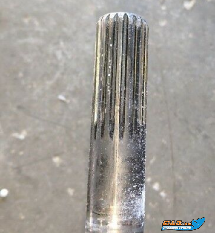 В общем вытащил вал вместе с импеллером, в рабочей зоне видно что грани немного слизаны и общий диаметр уменьшился. Возможно ответная часть тоже съедена, но пока не могу до неё добраться. По каталогу посмотрел, там вал идёт одной запчастью и на конце у него идёт резьба, а у меня шлицы как на полуоси. Мошт у меня самопал. Кто разбирал Ямахи, подскажите как там конструктивно всё устроено.