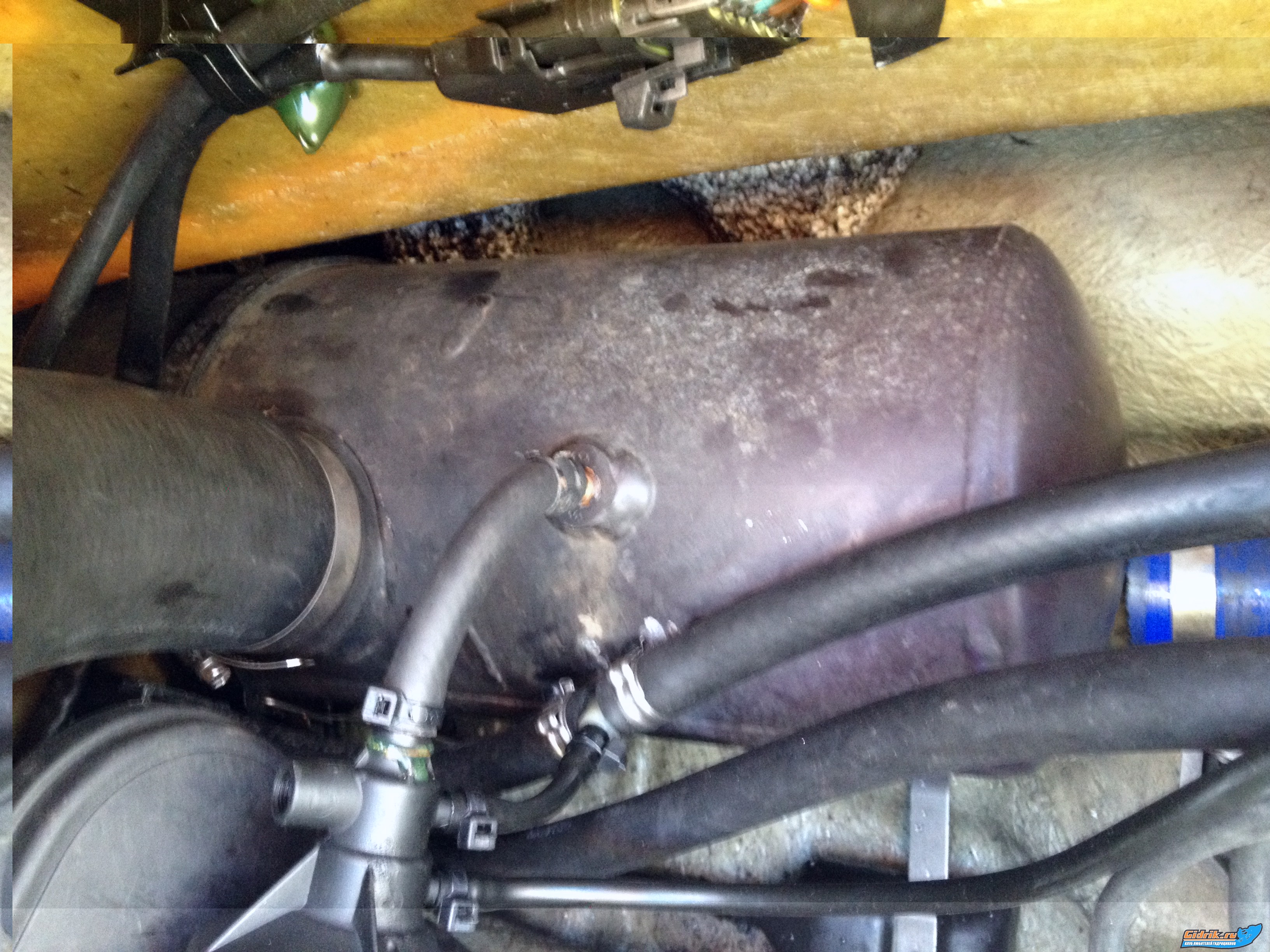 Последняя банка (ватер бокс , как я понял) ,ну греется так, что на фото видно как там выглядит пенопласт ... на неё водой брызгаешь - капли шипят, как будто на печку в бане брызнул... Вода в глушак попадает через рев клапан, который на ватер боксе, значит он неисправен получается, хотя немного воды он туда подаёт, но видемо мало, она же там всётаки была ???