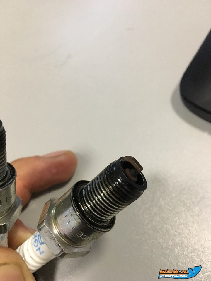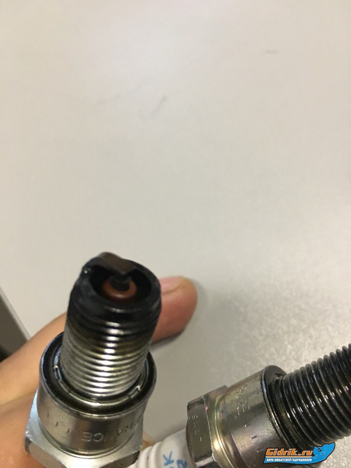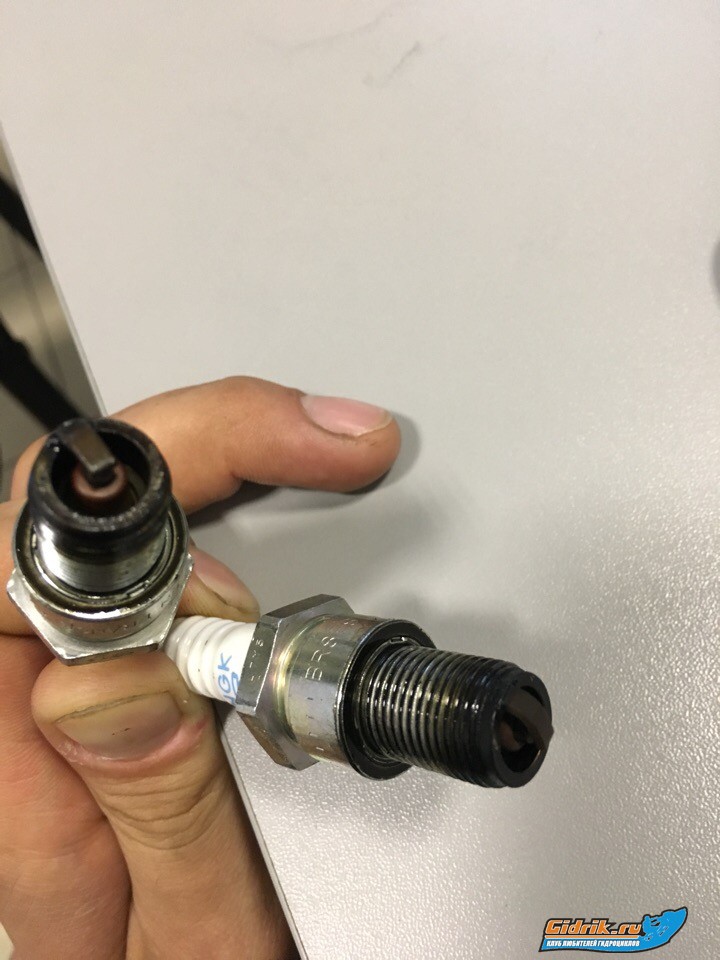 Так, вчера слил полностью топливо с бака, залил новое. Топливный фильтр прочистил и посмотрел резинку, всё там хорошо. Сегодня спустил на воду. Минут 10 катался всё было отлично, потом опять потихоньку стали обороты уменьшаться до 3500 об. Я попробовал чуть чуть вытащить подсос, он захлох. После этого завел, газ в пол, резкий выстрел из выхлопной трубы и он попер. Катался потом минут 20 точно, всё отлично. Двигатель теплый не горячий. И вот что еще заметил, верхний шланг который идет на клапан выхлопа дырявый и перемотан изолентой. Вчера я его перемотал, но спасибо, pdi@list.ru сейчас ниму клапан, посмотрю на него, почищу и шланг поменяю тогда) Завтра опять на тест поеду, отпишусь. П.С. заодно решил выкачать масло старое и залить новое MOTUL. Фото свечей в приложении