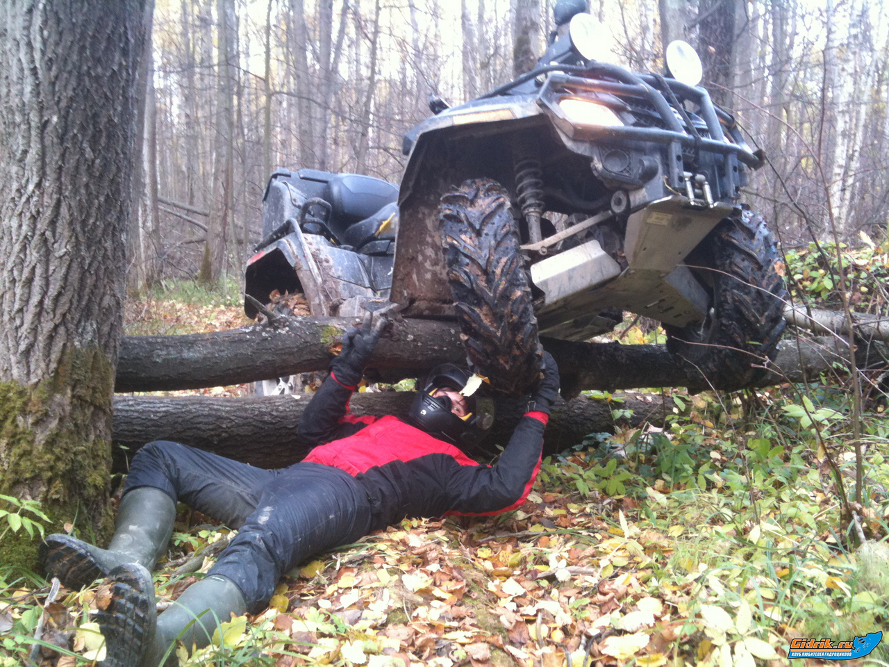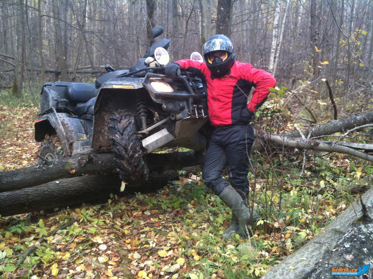 Очень жестко покатались в этот раз, грязи почти не было, ехали через лес километров 10, бурелом конкретный, перевернули квадр когда пытались преодолеть дерево, в результате отвалилась фара и расширитель крыла, оборвало кевларовый трос, далее двигаясь в глубь леса провалился в болото, еле вытащили потому что у Эндрю глючила лебедка, а свою я оборвал.