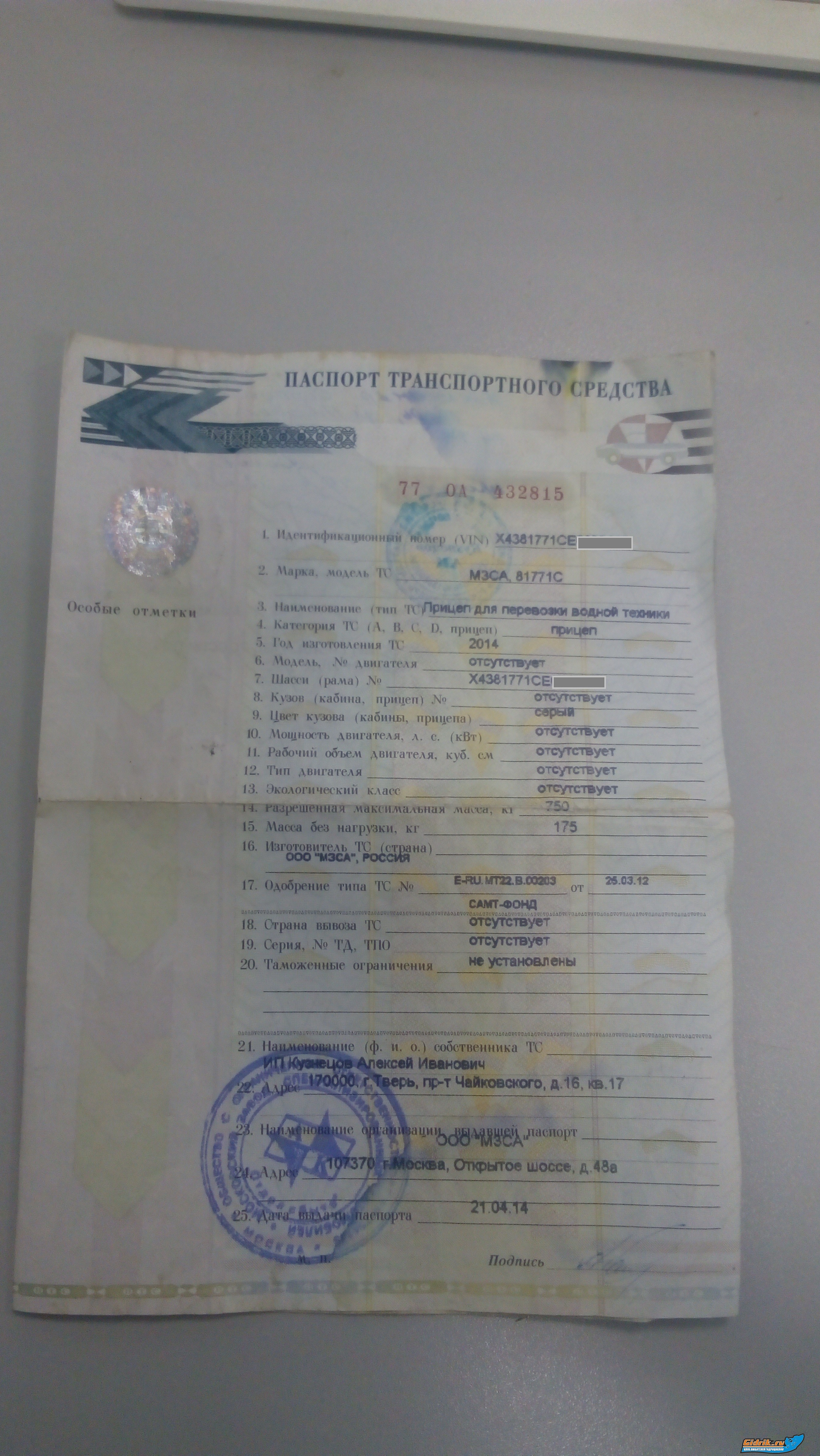 Продам ПТС от прицепа МЗСА 81771С, 2014 год, ПТС оформлен на меня. История такова, отдал одному товарищу абсолютно нульцевый прицеп в тот момент он занимался гидроциклами. Но бизнес у него не пошел и мой прицеп забрали за долги. Товарищ деньги то отдал, а ПТС у меня остался, теперь так и будет всю жизнь висеть на мне. Может быть кто-то из формучан сидит тут и у него тот самый прицеп, тогда у него есть шанс стать полноценным собственником. А так продаю ПТС за 10 тыс. Все вопросы в личку.