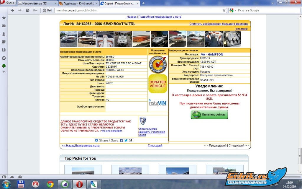 да не выгодно это. Копарт это страховой аукцион аварийной техники. Никаких гарантий..никаких возвратов. Может вообще без двига быть или с заклинившим мотором. Этот катер имеет трещину в борту выше привального бруса. сидушки на перетяжку. мотор вроде не утопленный. прицеп тоже нормальный по фото. Планирую под ключ здесь расстаться с 450-500тр.